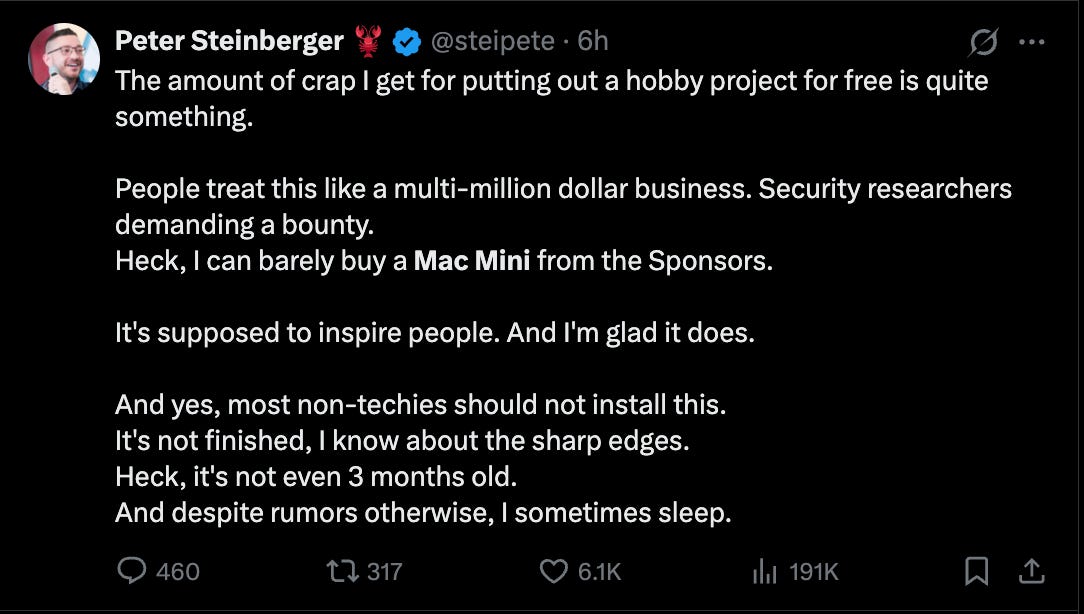 One moment it was a GitHub link circulating among tinkerers; the next it was a cultural reference point. Software only moves that fast when it arrives looking like something people have been waiting for, even if they didn’t quite know how to describe it yet. Peter Steinberger, the creator of this project, is struggling to keep up with its viral adoption.