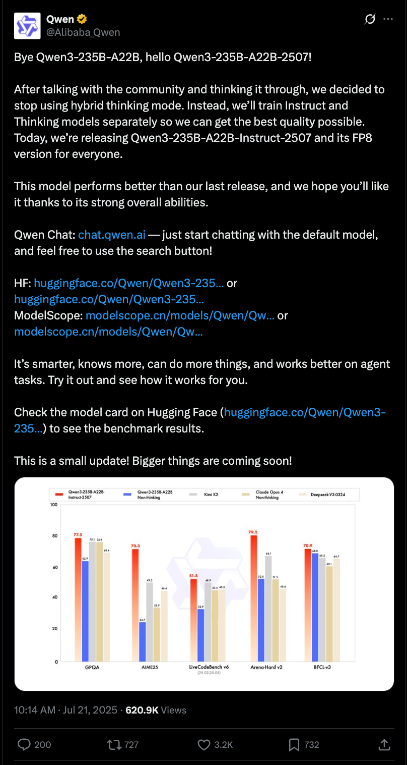 Then, just two weeks later, Alibaba’s Qwen3-235B-A22B-2507 dropped. A dense transformer model, fully open-sourced - training code, weights, tokenizer, the works - and now the highest-performing open-weight LLM to date, beating all others across MMLU, GSM8K, HumanEval, and ARC. Despite being roughly one-fourth the size, it proved faster, smaller, and smarter.