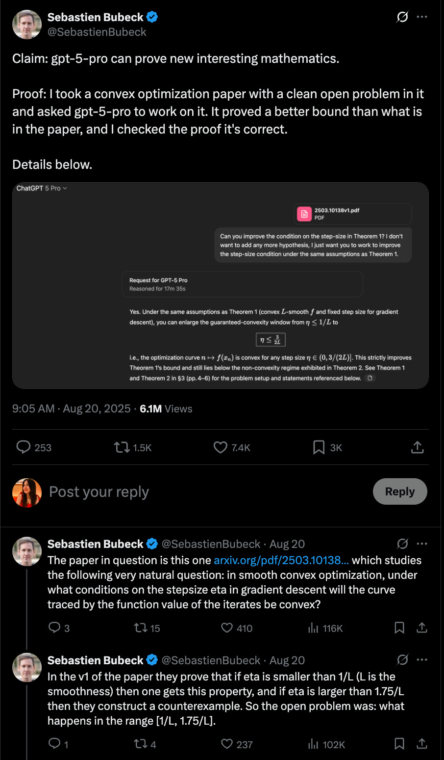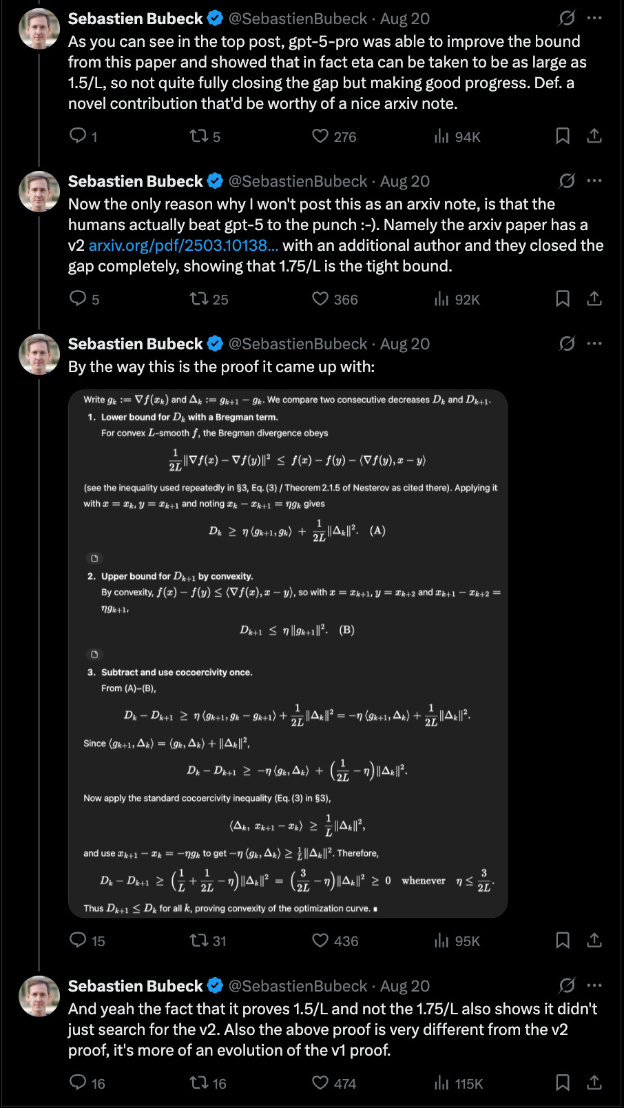 This brings us to a little incident this week. Sébastien Bubeck, a world expert in convex optimization who now works at OpenAI, gave GPT-5-Pro an open problem from a recent paper.