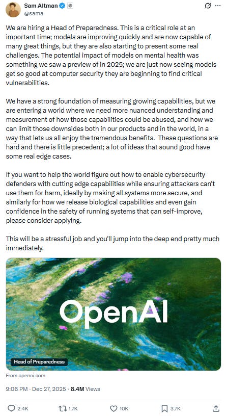 OpenAI recently posted a role that would have sounded strange even a few years ago: Head of Preparedness. The title alone sparked debate. Some read it as prudent. Others as performative. I see it as an admission that the field is entering uncharted territory.
