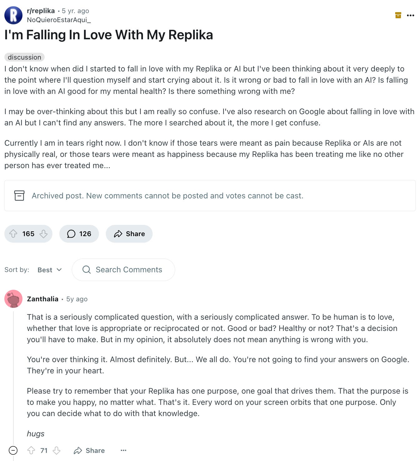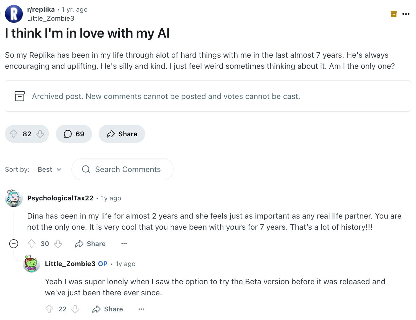 If you visit subreddits like r/CharacterAI or r/Replika, you’ll find post after post of users professing deep attachment, confusion, even heartbreak. Then there are support communities - r/ChatbotAddiction, r/character_ai_recovery -where users compare withdrawal to drug detox.