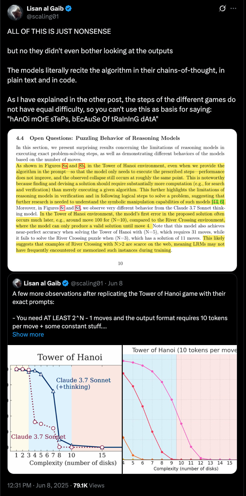 Since its release, there has been ample debate, with significant pushback from the ML community. Some argue that the paper set CoT up to fail by stripping it of the context in which it actually shines. Apple tested CoT in isolation - no tools, no memory, no function calling, no iterative verification - ignoring how modern systems scaffold reasoning through external aids. Others point out that the paper imposed tight token limits, artificially cutting off longer reasoning chains that could have succeeded if given the space.